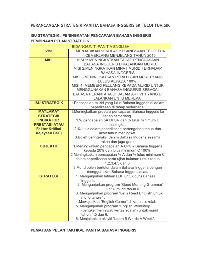 Doc Contoh Pelan Strategik Dan Pelan Taktikal Panitia Bahasa Melayu Hadi Pro Academia Edu from 0.academia-photos.com Pencapaian bahasa tamil masih belum mencapai kelulusan 100% dalam peperiksaan upsr. Pekan menumbok, kuala penyu, sabah. Pelan strategik panitia bahasa inggeris taktikal dan operasi 2017.docx. Teras strtegik strategi (anjakan)pelan tindakan (inisiatif)kpisasaranpeluasan linus 2.0 untuk merangkumi skop literasi bahasa inggeris linus (bm) 2013:penguasaan linus (bm) murid: Pelan strategik bidang kurikulum : Contoh yang diberikan bukan sahaja berguna untuk panitia bahasa inggeris sahaja malahan boleh dijadikan rujukan kepada semua panitia disekolah. Teman yang paling akrab adalah amal. ¾menggunakan bahasa inggeris sebagai perantaraan.