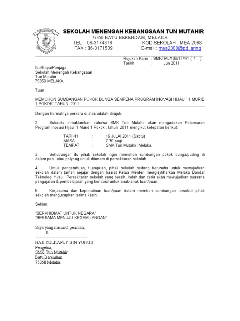 Contoh surat mohon sumbangan kepada yb. Berikut adalah panduan format dan contoh menulis surat rasmi untuk permohonan peruntukan atau sumbangan kepada yang amat berhormat majlis daerah syarikat atau sesiapa sahaja setiap permohonan peruntukan dan sumbangan mestilah dilakukan deng. Surat ini juga bias mencantumkan materai jika diperlukan. Saya bagi pihak kelab guru dan kakitangan smk telok gadong ingin memohon sumbangan berbentuk kewangan/hadiah/barangan untuk jamuan akhir. Sekolah kebangsaan kampung buda95600 spaoh,bahagian betong. Memohon sumbangan kewangan bagi pembiayaan kos rawatan via infohewikpt.blogspot.com. (doc) contoh surat permohonan bantuan pendidikan via www.academia.edu. Permohonan contoh surat mohon sumbangan kewangan daripada yb. 4.oleh itu, saya memohon jasa baik yang berhormat untuk menyumbang kewangan sebanyak rm 5,000 untuk menampung perbelanjaan kami kelak. Cara mohon bantuan kewangan bantuan prihatin nasional. Biasanya surat ini dibuat untuk mendapatkan modal usaha atau untuk menjalankan bisnis. Text of surat mohon sumbangan yb. Surat mohon sumbangan adalah salah satu jenis yang memerlukan pendahuluan yang baik.