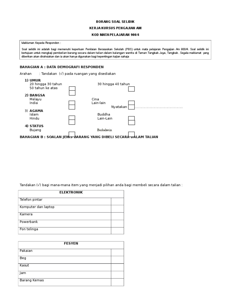 Related : Contoh Soalan Soal Selidik Pengajian Am - Borang Soal Selidik Pa Borang Soal Selidik Kerja Kursus Pengajian Am Kod Mata Pelajaran 900 4 Makluman Kepada Responden Soal Selidik Ini Adalah Bagi Course Hero : Download borang soal selidik (pengajian am)..